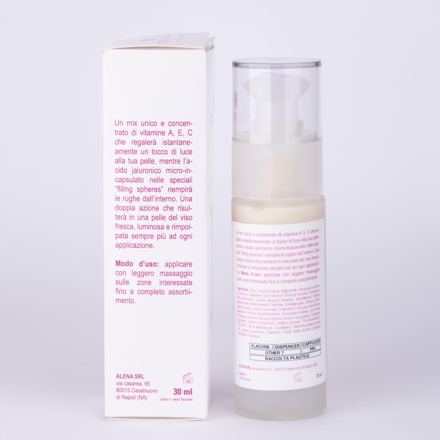 - Effetto Filler Immediato: L'acido ialuronico micro-incapsulato in speciali "filling spheres" penetra nei tessuti e rimpolpa le rughe dall'interno.